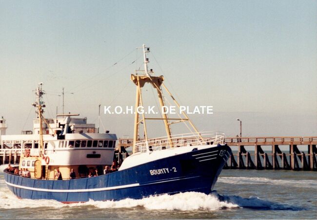 Formaat : 9 x 12,5 cm. - Sportvissersvaartuig "Bounty-2" van de rederij Bounty in de havengeul. Voorheen, boomkortreiler gebouwd in 1970 met als namen o.a. VL30 "Elisabeth Maria"... Op de achtergrond,…