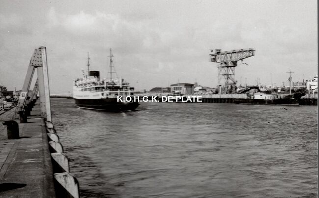 Formaat : 10 x 16,5 cm. - Pakketboot "Rio Leopold II" in de havengeul met op de voorgrond het Weststaketsel.