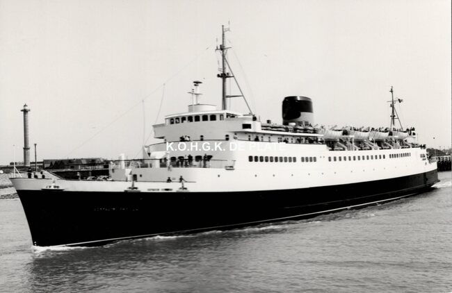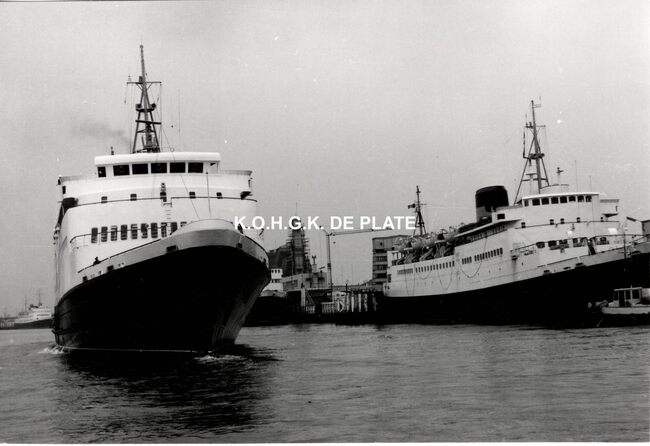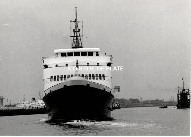 Formaat : 10 x 16,5 cm. - Carferry "Koningn Fabiola" in de havengeul. Links, op de oosteroever, de vierde vuurtoren (Lange Nelle). Gebouwd op de scheepswerf Jos. Boel en Zonen (Temse). Het schip liep van stapel…