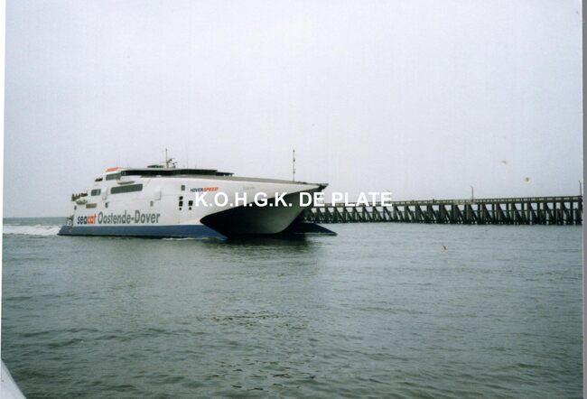 Formaat : 9 x 13 cm. - SeaCat "Eapide van Hoverspeed Oostende-Dover vaart de haven van Oostende binnen. Op de achtergrond het Ooststaketsel.
