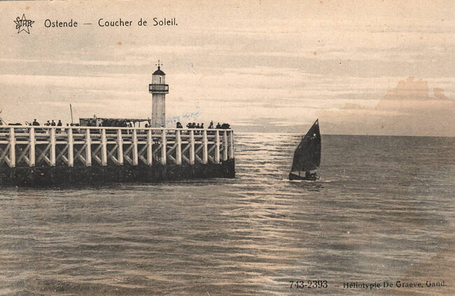 Star, N° 743-2393. Héliotypie De Graeve, Gand. - Ostende - Coucher de Soleil. - Een Oostendse schover vaart de havengeul van Oostende binnen. We zien het einde van het Weststaketsel met het ijzeren torentje met mistbel.…