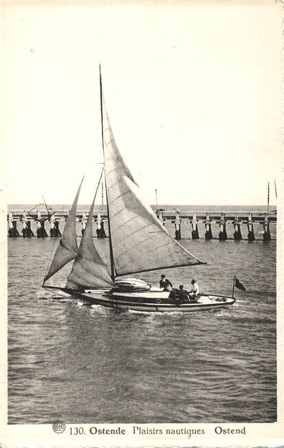Albert, N° 130. Phototypie A. Dohmen, Bruxelles. - Ostende - Plaisirs nautiques. Ostende. - Zeiljacht in de havengeul van Oostende. Op de achtergrond, het Ooststaketsel.