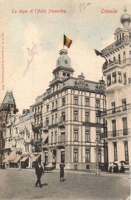 Ed. V.G. [=Victor Grégoire], N°204. 42,Avenue du Midi Bruxelles. - Ostende - La digue et l'Hotel Alexandra. Bijgekleurde kaart. - Het hotel was gelegen op de hoek met de Hertstraat.