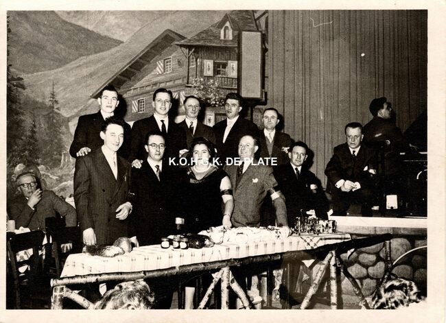 Formaat : 12 x 17 cm. - Het bal ging door in "In 't Witte Paard". Helemaal links zittend met bril boekhouder Zeebroeck. Achter de tafel op de eerste rij v.l.n.r. Sylvère Vandecasteele, Jacques Tratsaert,…