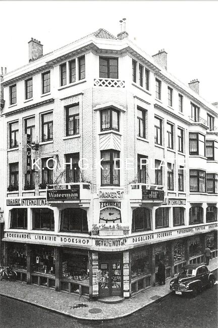 Formaat : 15 x 10 cm. - Interieur van de boekhandel met de heer en mevrouw Devriendt, hun dochter Gilberte en hun schoonzoon Charles Heilman (1948)