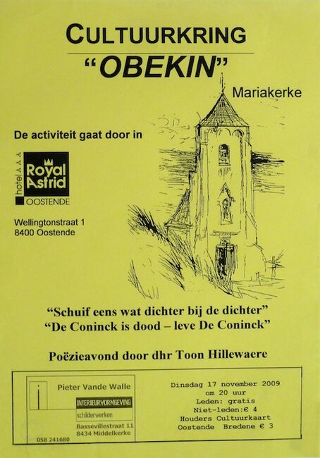 Affiche : Cultuurkring Obekin. "Schuif eens wat dichter bij de dichter", "De Coninck is dood - leve De Coninck". Hotel Royal Astrid. 17/11/2009