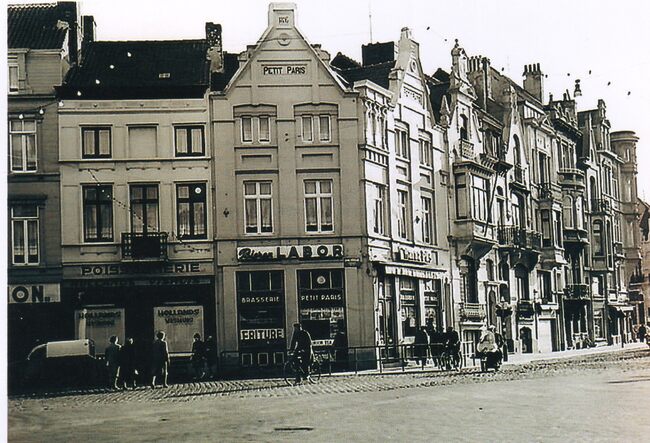 Foto, formaat : 13.5 x 9.5 cm. - Petit Paris, hoek Alfons Pieterslaan en Torhoutsesteenweg. Naast de brasserie "Petit Paris", de vishandel van Jacob Pels, in de volksmond "Den Hollander".