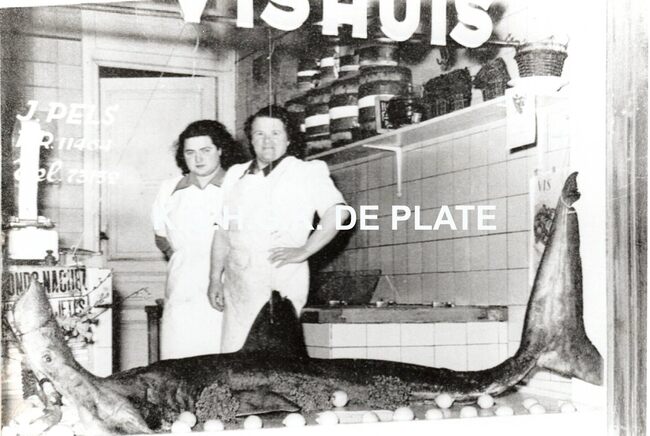 Formaat : 9 x 12,5 cm. - De vishandel van Jacob Pels, in de volksmond genoemd "Den Hollander". Gelegen in de Alfons Pieterslaan nabij het kruispunt Petit Paris. Zijn echtgenote, Elisabeth Van de Groenendaal en…