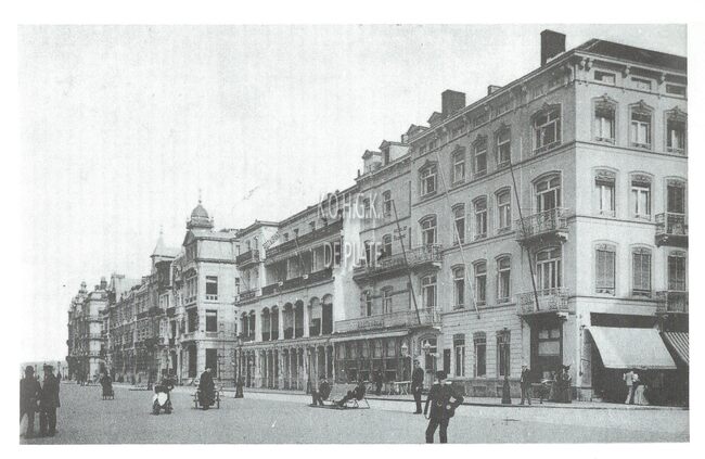 Zwart/wit foto Antony 140925-6- Formaat : 24 x 30 cm. – Majestic Palace, Hotel du Kursaal en Beau Site op de Zeedijk gezien van op het strand. Op de gevel van het Majestic Palace stonden ter hoogte van de tweede…