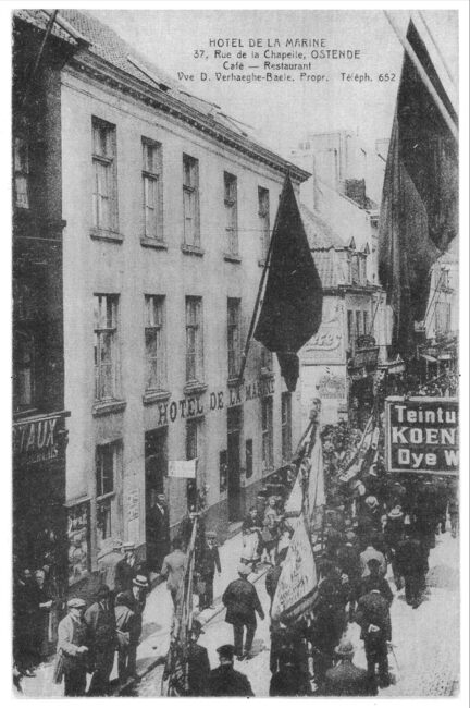De Kapellestraat, gezien richting Wapenplein. Het "Hotel de la Marine" was gelegen op de hoek van de Kapelle- en de Oostraat. Tijdens de Eerste Wereldoorlog deed het hotel dienst als hospitaal ter verpleging van de…