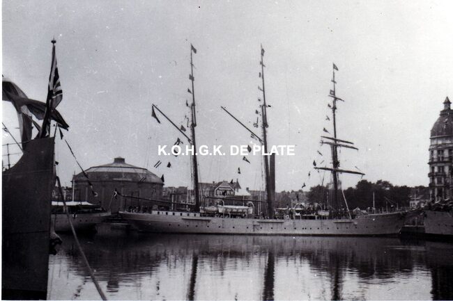 Formaat : 10 x 15 cm. - Het zeil- en schoolschip "Mercator" in het tweede handelsdok met op de achtergrond het "Panorama van den Ijzer" en rechts het "Hôtel des Thermes", in de volksmond het…