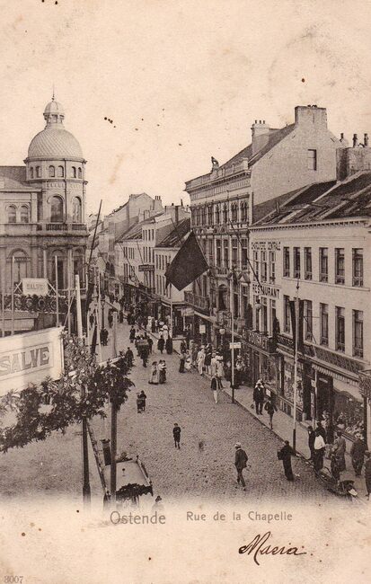 Rue de la Chapelle. - De Kapellestraat, gezien vanaf het Wapenplein. Op de hoek met de Sint-Sebastiaanstraat, het "Hotel du Lion d'Or", Wapenplein 2. Hotelhouder was Jean Cnudde