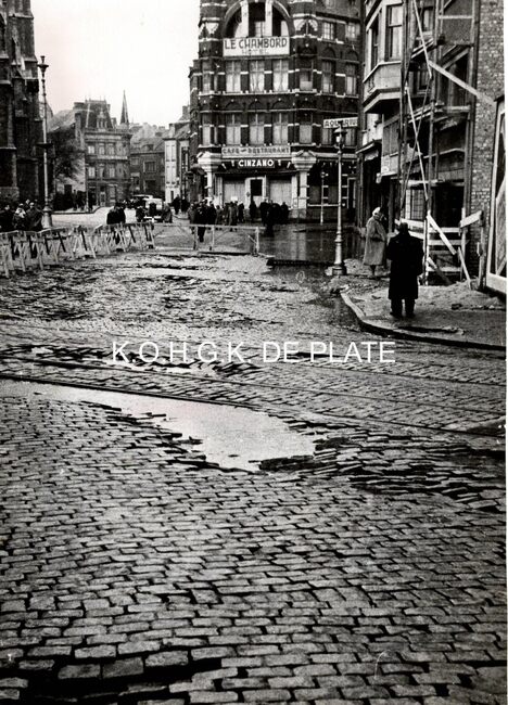 Formaat : 13 x 1= cm. - Zijkant van het monument voor de oorlogsslachtoffers op het Sint-Petrus- en -Paulusplein. Rechts het zeemanshuis en aquarium op de hoek met de Paster Pypestraat. Rechts op de achtergrond, op de…