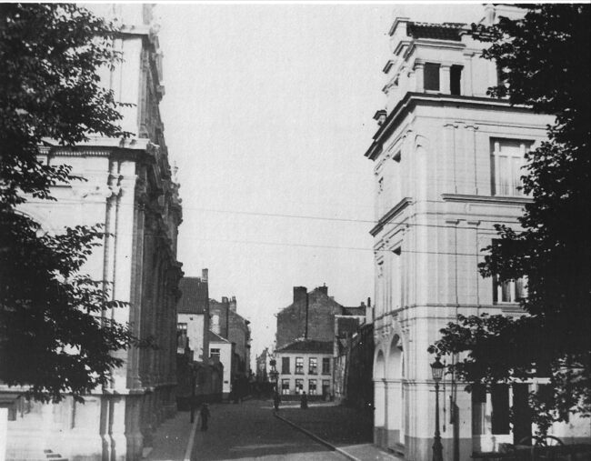 Foto : De Poststraat (1910). Links de zijgevel van het postgebouw en rechts het "Hotel Parc Leopold"