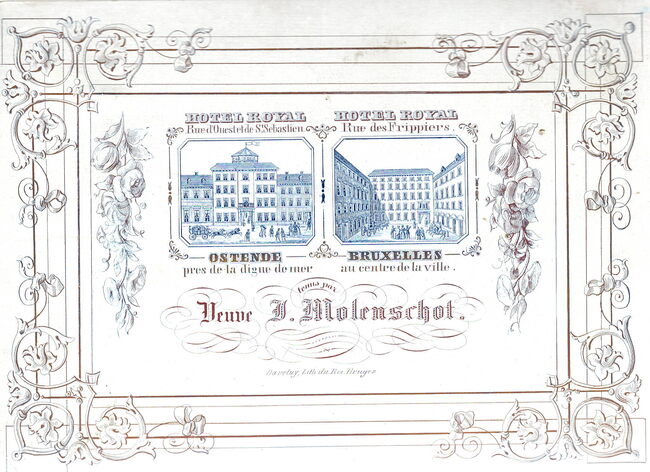 Formaat : 11,3 x 15,6 cm. - Hotel Royal Rue d' Ouest et de St Sebastien Ostende pres de la digue de mer. Hotel Royal Rue des Frippiers Bruxelles au centre de la ville tenu par Veuve J.Molenschot. Het hotel was…