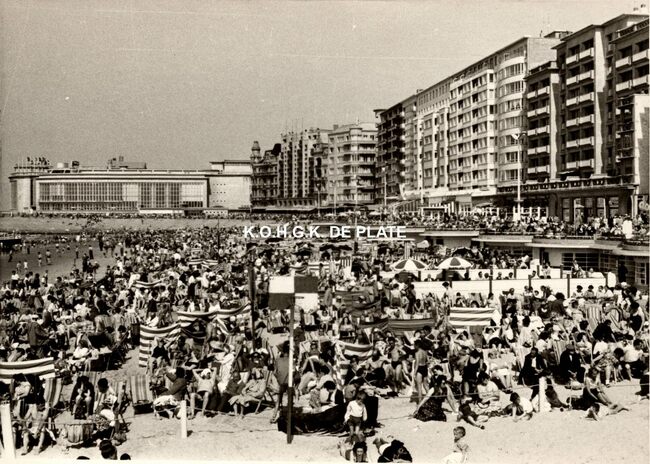 Formaat : 12 x 17 cm. - Toeristen op het Groot Strand nabij de badinstallaties. In de achtergrond het kursaal en de hotels langs de Albert I-Promenade