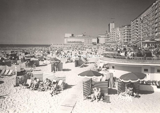 Formaat : 12 x 17 cm. - Groot Strand met spelende kinderen, zonnekloppers nabij de badinstallaties. In de achtergrond het kursaal en de hotels langs de Albert I-Promenade