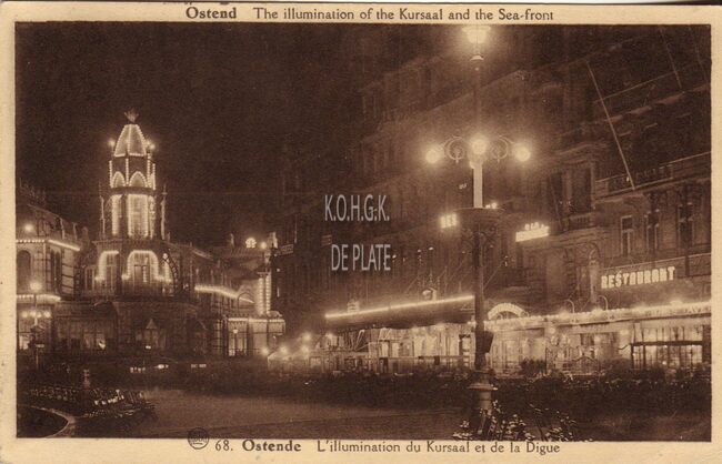 Albert, N° 68. - Ostende - The illumination of the Kursaal and the Sea-front. - Ostende - L'illumination du Kursaal et de la Digue. - Nachtopname van de Zeedijk met de hoek van de Kursaal-Westhelling.