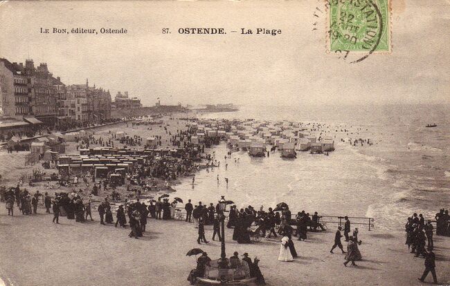 Le Bon 87. - Ostende - La plage. De Zeedijk gezien vanaf Petit Nice richting Koninklijk Chalet. Rechts, strandrecreatie op het Groot Strand. Vooraan, de talrijke strandtenten voor beschutting tegen wind en zon en…