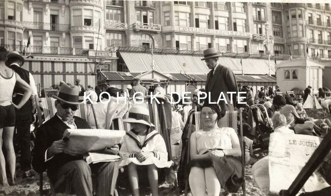 Formaat : 6 x 10,5 cm. - Genieten van een zomerse dag. Vader leest Op de achtergrond, de Albert I-promenade met de grote hotels