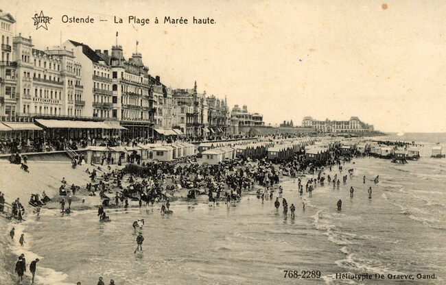 Star. - Strandrecreatie op het Groot Strand gezien ten westen van het Kursaal, richting het Koninklijk Chalet (midden) en op het einde het Royal Palace Hotel. Links, de Zeedijk en de grote hotels.