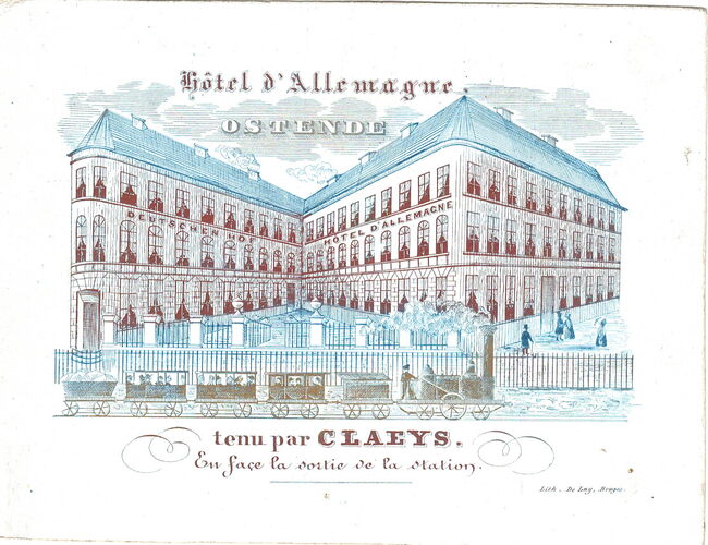 Hotel d'Allemagne tenu par Claeys. Rue du Polder à Ostende. Cet Etablisement tout récamment décoré et meublé, situé en face de l'endroit destiné à établir la station du chemin de fer en ville et au passage pour…