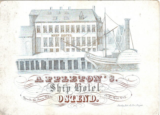 Formaat : 10,2 x 14,2 cm. - Appleton's Ship Hotel Ostend. Opposite the Steam Pakets On the Quai N° 15. Het hotel was gelegen Visserskaai 15. Zie ook Ship Hotel (Visserskaai)