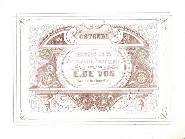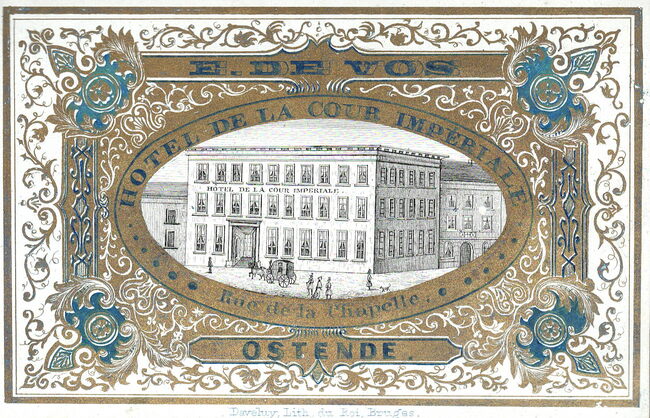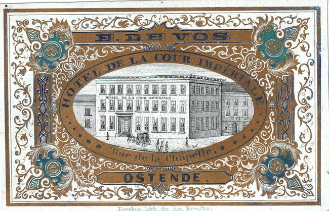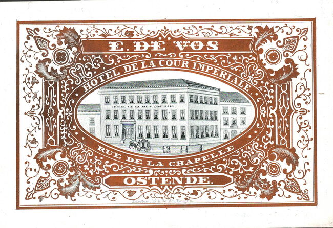 Hôtel de la Cour Impériale. E.De Vos Ostende. Ce bel Etablissement avantageusement connu depuis nombres années situé au centre de la Ville à proximité de la station de chemin de fer et des Bains de mer .Vient d'être…