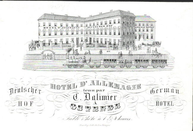 Format : 8,5 x 13 cm. - Hotel d'Allemagne tenu par C. Dalimier à Ostende. Deutscher Hof. German Hotel. Table d'hôte à 1 & 4 heures.