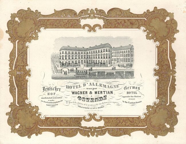 Formaat : 17,5 x 21,2 cm. - Hotel D'Allemagne tenu par Wagner & Mertian à Ostende. - En face de la station et à proximité des bateaux à vapeur. - Table d'hôte à 2 et 5 heures. - Deutscher Hof dem Bahnhofe…