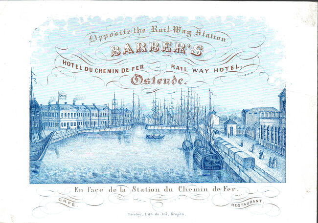 Formaat : 10,2 x 14,5 cm. - Opposite the Rail-Way Station - Barber's Hôtel du Chemin de Fer - Rail-Way Hotel - Ostende - En face de la Station du Chemin de Fer .Café. Restaurant. Gelegen op de hoek van de…