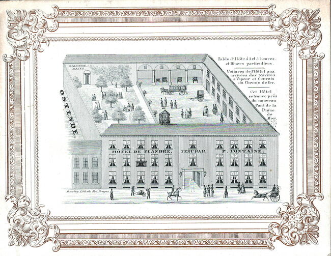 Formaat : 11 x 14,1 cm. - Hôtel de Flandre tenu par P.Fontaine Ostende. Salle de Bains. Table d'Hôte à 1 et 5 heures et Diners particuliers. Voitures de l'Hôtel aux arrivées des Navires a Vapeur et Convois du…