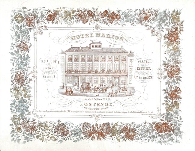 Formaat : 17,7 x 22,6 cm. - Hotel Marion. Rue de l'Eglise 26 & 27 à Ostende. Commerce de vins en gros. Table d'Hôte 1 & 4 heures. Vastes écuries et remises. Cet Hôtel nouvellement restauré & meublé…
