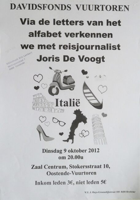 Affiche : Davidsfonds Vuurtoren. Via de letters van het alfabet verkennen we met reisjournalis Joris De Voogt Italië. Zaal Centrum. 9/10/2012