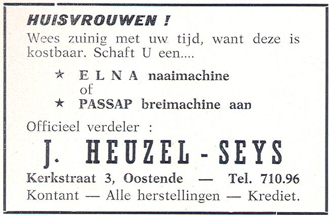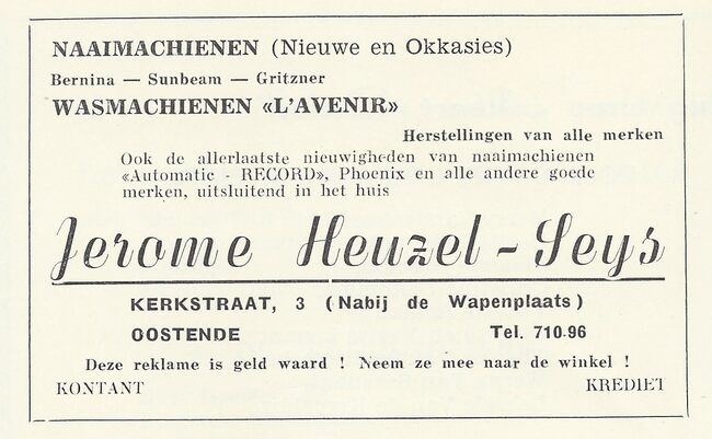 Advertentie : Jerome Heuzel-Seys. Naaimachines - Wasmachienen "L'Avenir". Kerkstraat 3, Oostende