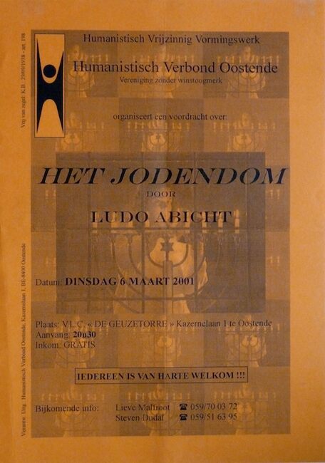 Affiche : Humanistisch Verbond Oostende. Het Jodendom. VLC De Geuzetorre. 6/03/2001.