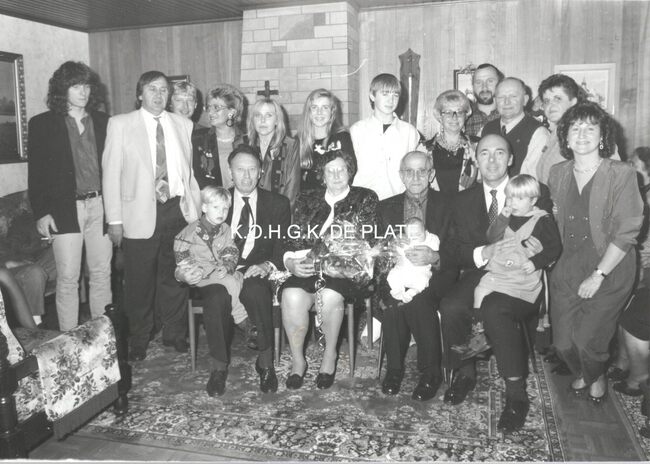 Burgemeester Adolf VAN GLABBEKE op een gouden(of diamanten) bruiloft,achter de burgemeester staan de heer en mevrouw WALLYN met hun zoons John en Marc (achteraan).Mogelijk zijn de jubilarissen de ouders van mevrouw WALLYN…