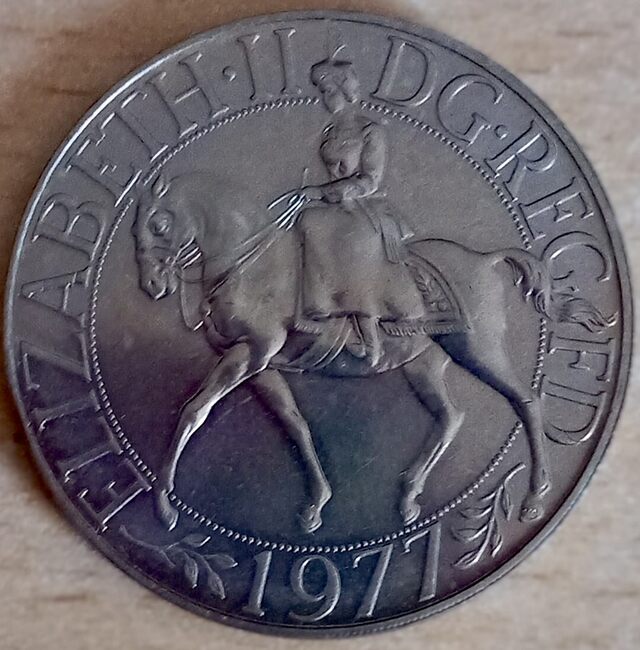 Op de voorzijde : rondom ELIZABETH II DG. REG FD 1977, centraal een afbeelding…