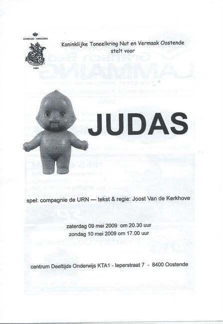 Programma : Koninklijke toneelkring Nut en Vermaak stelt voor. Compagnie de URN. Judas. Centrum Deeltijds Onderwijs KTA1, Ieperstraat 7. 09-10/05/2009