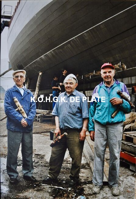 Foto met drie scheepstimmerlieden : Louis Pincket, Norbert Ramoudt en Jacques Delrue. Op de scheepswerf "Maritime Site Oostende" werd de Oostendse sloep (De Nele) gebouwd. Het schip werd gekalfaat door deze drie…