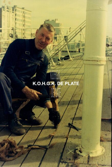 Foto : 18,5 x 12,5 cm. - Maurits Eerebout kalfaat het dek van de "Mercator". Kalfaten of breeuwen is de naden van het dek of de scheepsromp waterdicht maken door middel van geteerd gepluisd touwwerk. Hij…