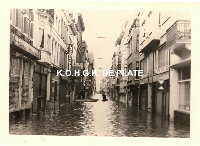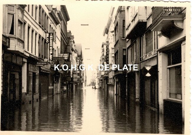 Tropic T 406. - Ostende oender woater 1953. - Hoek Kapelle- en Jozef II-straat. Op de hoek, de wijn en likeurenhandel G. Ackermans en in de Kapellestraat, herenkledij Marvan en het grootwarenhuis Samar