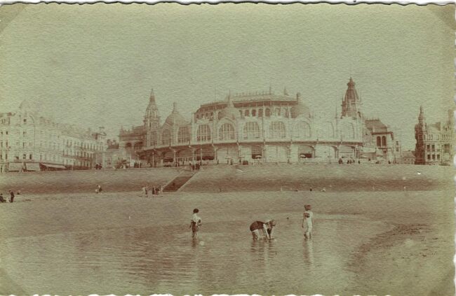 De noordgevel van het derde Kursaal langs de Zeedijk, gezien vanaf het Groot Strand. Kinderen pootjebaden in een "kelle"