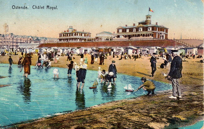 Le Bon, éditeur, Ostende, N° 5. - Ostende - Châlet Royal. - Bijgekleurde kaart. - Het Koninklijke Chalet langs de Zeedijk. Kinderen spelen met hun zeilbootjes in een "kelle" (kil) op het Groot Strand. Op de…