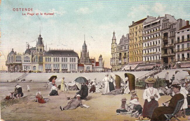 Trenkler. [Dr. Trenkler Co, Bruxelles. Osd. 56]. Ostende - La Plage et le Kursaal. Gekleurde kaart. De westgevel en de Zeedijk met de hotels en villa's. Strandrecreatie op het "groot strand". Een vrouw met…