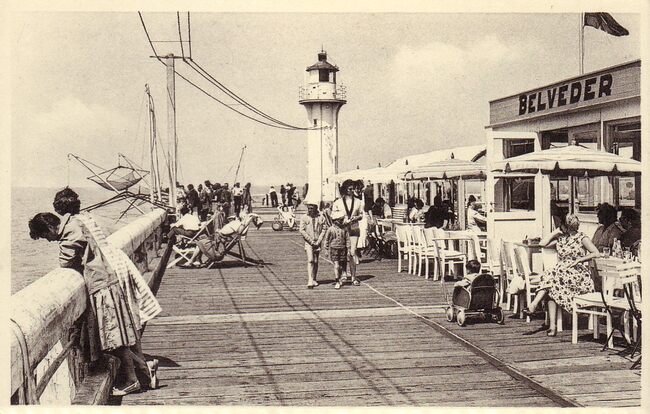 Nels n° 27. - De havendam. - Het Weststaketsel met op het einde het ijzeren wit torentje met vast groen licht zichtbaar vanuit zee. Electrische mistbel (klok) met slag alle 4 seconden. Rechts het café-paviljoen "…