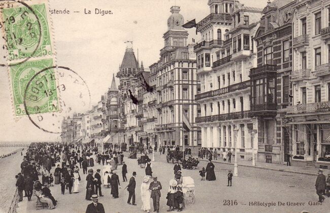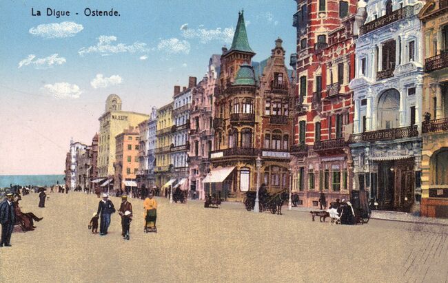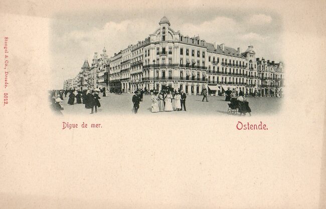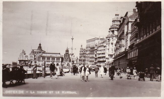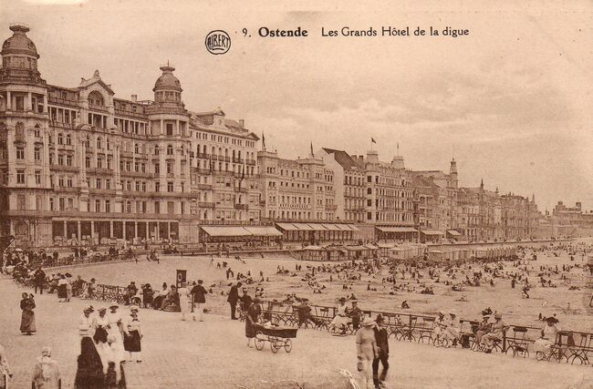 Albert Dohmen 9. - Ostende - Les Grands Hôtels de la digue. De Albert I-promenade met de grote hotels, gezien vanaf het Kursaal richting het Koninklijk Chalet. Het plekje waar die mevrouw wandelt met haar kinderwagen…