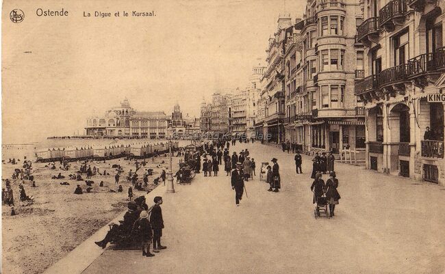 Nels, Série 13 ,N° 40. - Ostende - La Digue et le Kursaal. - Wandelen op de Zeedijk in het interbellum. Op de hoek met de Kemmelbergstraat, "The Princess's Hotel". Links, het Groot Strand met de…
