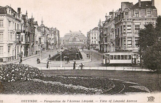 Neurdein/ND Phot 312. - Ostende - Perspective de l'Avenue Léopold - View of Léopold Avenue. De Leopoldlaan gezien vanaf het Leopoldpark, richting de zuidgevel van het derde Kursaal. Een stadstram op de hoek met…