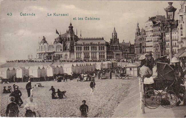 N°43. - Ostende - Le Kursaal et les Cabines. - Het Groot Strand vol met badkarren. De Zeedijk en de westelijke gevel van het derde Kursaal.